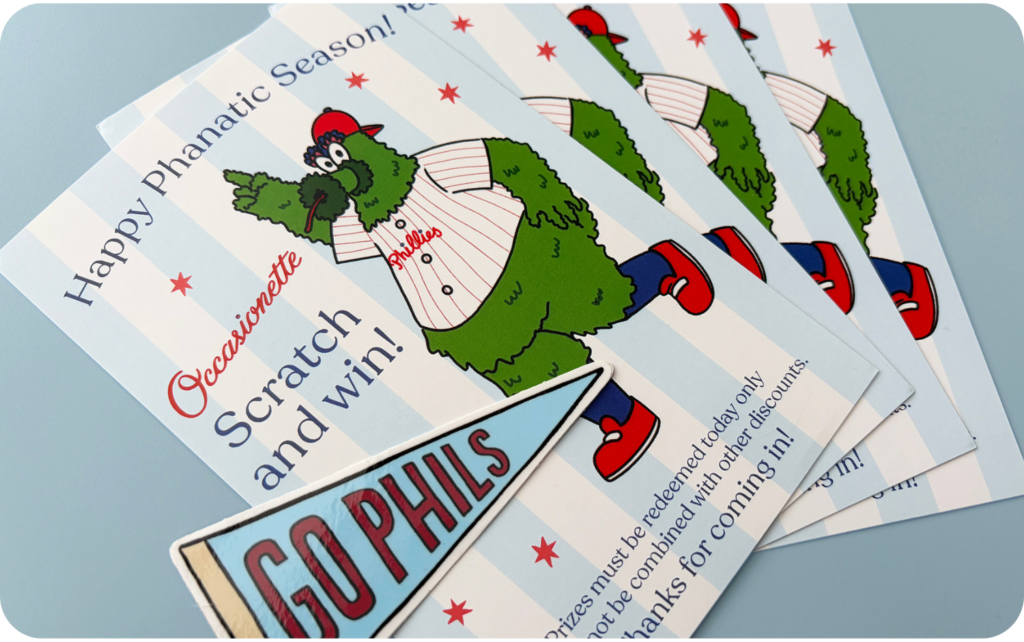 On March 26th, we’re celebrating the Phillies season opener with our annual Phanatic Scratch off event at the 3 shops! Be there when the doors open at 10 am (warning, they will go fast!) to snag a scratch off postcard, scratch and win fun freebies or exclusive discounts!