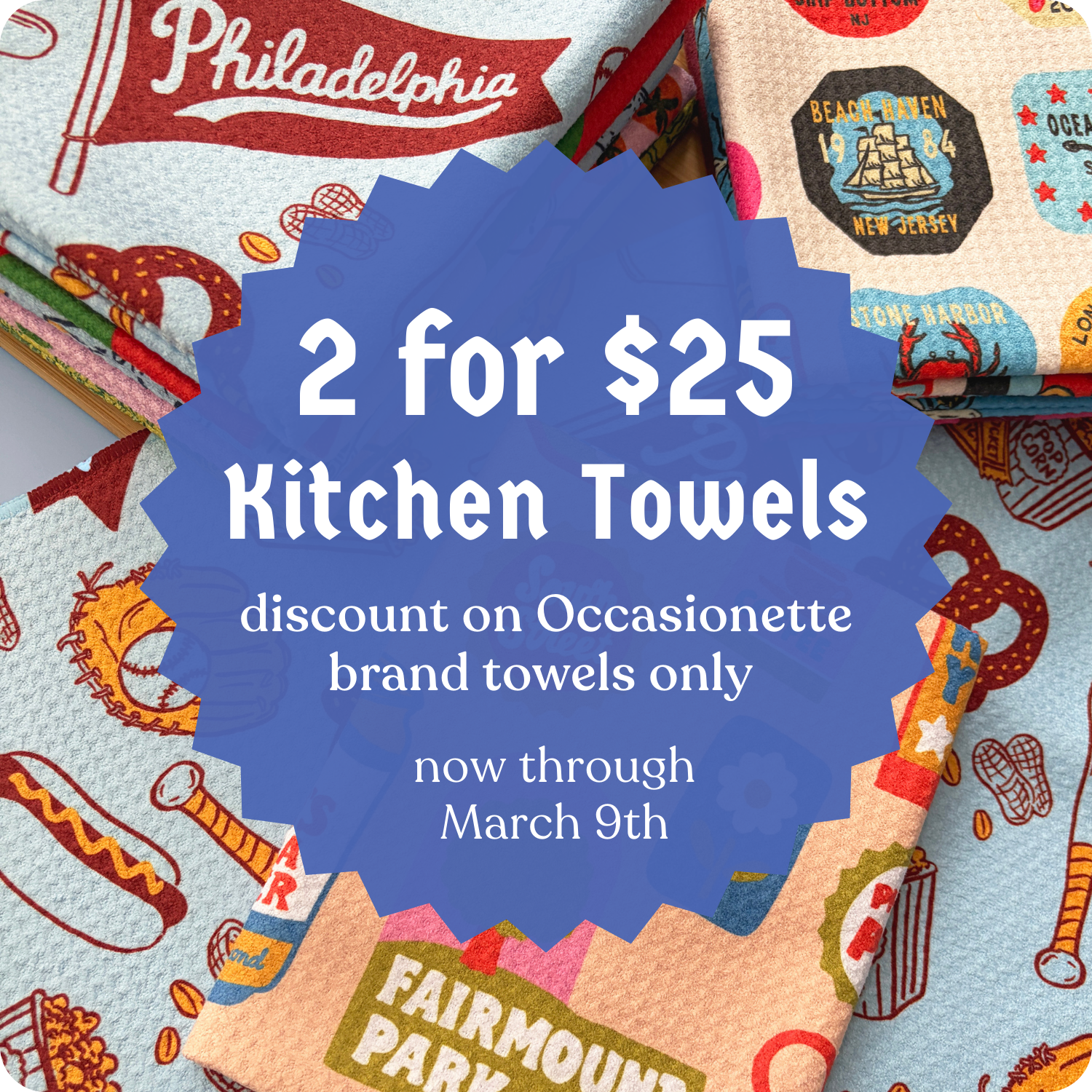 We’ve freshened up the shops for Spring with oodles of new goodies, including our new Occasionette Spring towel collection! We’re celebrating the warmer weather with a sweet deal, 2 for $25 (usually $32!) This discount ends on 3/9.Visit the shops or snag them on our webshop! Spring is in the air and the shops are buzzing with new product and excited customers. We are currently hiring full and part time Customer Service Team members, as well as an Assistant Shop Manager! On March 26th, we’re celebrating the Phillies season opener with our annual Phanatic Scratch off event at the 3 shops! Be there when the doors open at 10 am (warning, they will go fast!) to snag a scratch off postcard, scratch and win fun freebies or exclusive discounts!LocationsCollingswood, New Jersey – 724 Haddon AvenueEast Passyunk Ave, Philadelphia – 1704 E. Passyunk AveChestnut Hill, Philadelphia – 8521 Germantown Ave Shop hoursMonday – Saturday: 10am – 7pmSunday: 10am – 5pm It’s so nice to get out of the house and actually see people outside after being cooped up the past few weeks! Next time you’re out and about, stop in to say hi and see all the newness – if you’re like me, it will make you feel absolutely giddy about the return of nice weather.Cheers! -sara and the Occasionette team |