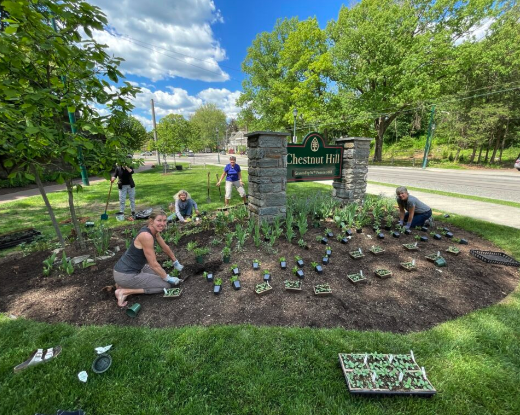 Parklets with plantings tended by the Fund (with help from our partners Pennsylvania Turf Company, Tom Ryan & Co., and others) include Cliff Park, Memorial Park, and Peace Park — all located near the bottom of Chestnut Hill — as well as the areas around the welcome signs that greet drivers, pedestrians, and cyclists as they enter and exit the Hill.