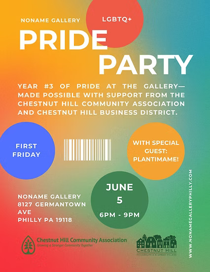 Join us for our 3rd Annual Pride Party on First Friday, June 5th from 6–9PM at NoName Gallery, located at 8127 Germantown Ave in the heart of Chestnut Hill. This annual celebration has become one of our favorite nights of the year—a chance to come together, show up as we are, and celebrate community in a way that feels real, welcoming, and fun.