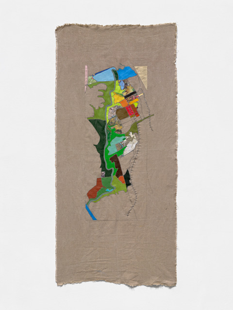 Working on raw linen and canvas, Meigs traces the routes she travels between family homes and the park, transferring these streets onto the surface as black linear paths. Within these mapped structures, she layers photographs, park materials, and color fields drawn from vivid moments of observation, such as seasonal shifts in foliage, and remembered encounters along the trails.