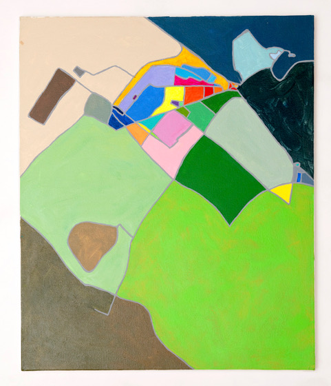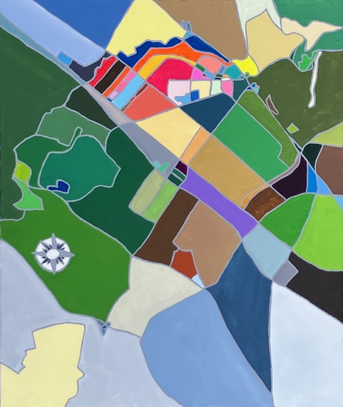 The exhibition brings together two bodies of work that map the artist’s lived experience of place: new paintings inspired by Philadelphia’s Wissahickon Valley and selections from Mapping Palo Alto, created after Meigs relocated to the Bay Area.
