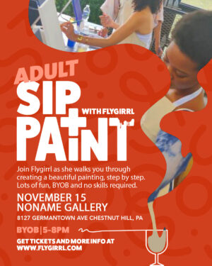 Sip & Paint is a fun and friendly environment where you’re able to take a blank canvas and transform it into a beautiful piece of Art as you follow Flygirrl’s direction. She will walk you through creating a beautiful painting, step by step. No prior skills needed!