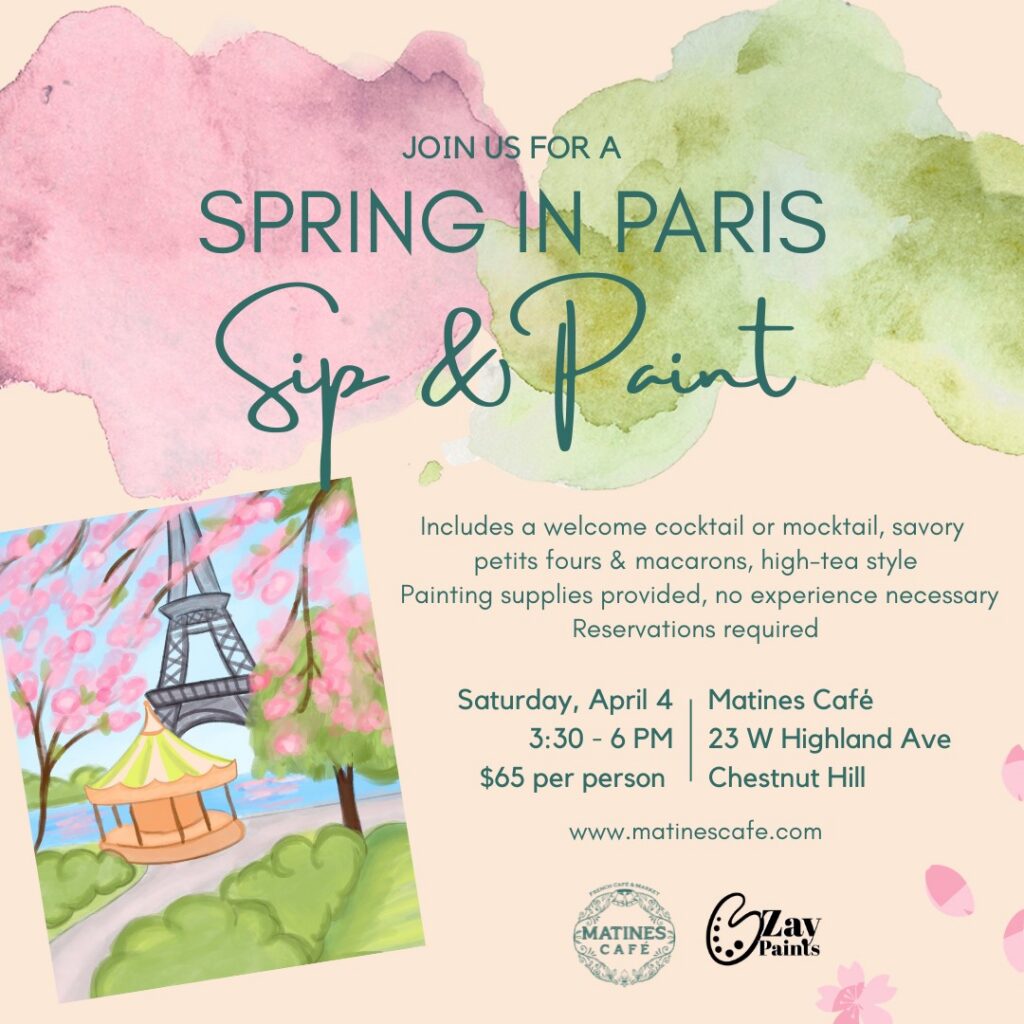 We are excited to announce our first Sip & Paint event at Matines Café in Chestnut Hill this Saturday from 3:30 PM to 6:00 PM. After several successful events at our Wayne location, we look forward to bringing this experience to Chestnut Hill!