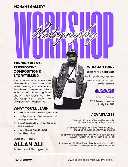 We begin with a 90-minute class at NoName Gallery, focused on shifting your perspective—both technically and creatively. Through real-world examples, guided discussion, and practical frameworks, you’ll explore how composition, light, and intention can elevate your images from documentation to storytelling.