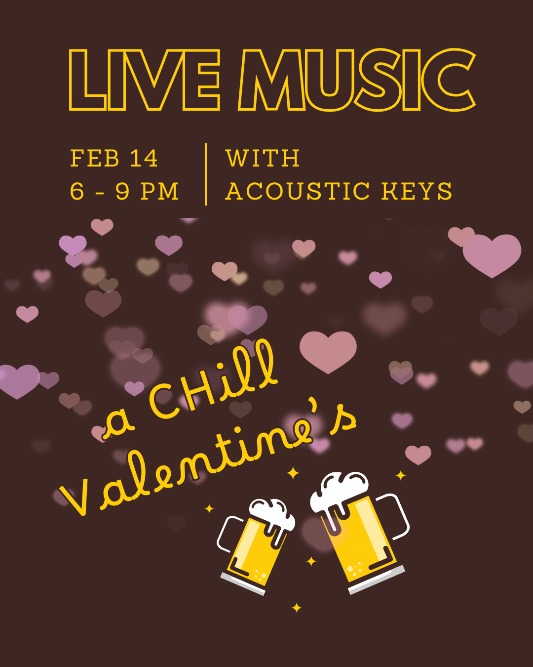Live Music: Acoustic Keys Chestnut Hill Brewing Company will have live music on Valentine’s Day! Join them for a live performance with Acoustic Keys on Saturday, February 14, 6 – 9 pm.